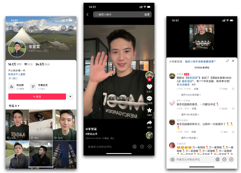 他更多的是把短视频当做朋友圈来发,让网友感觉自己来着不是割韭菜的,频频“乐善好施”,让“赌性”极强的粉丝们疯狂参与、关注、评论,可以将视频推到一个更大的流量池。