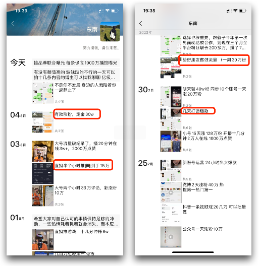 这是东南朋友圈展示的内容,能够看得出来,东南是要复制无数个自己,然后通过帮涨粉、帮接广告,打造「炫富+福利号」赛道的MCN。