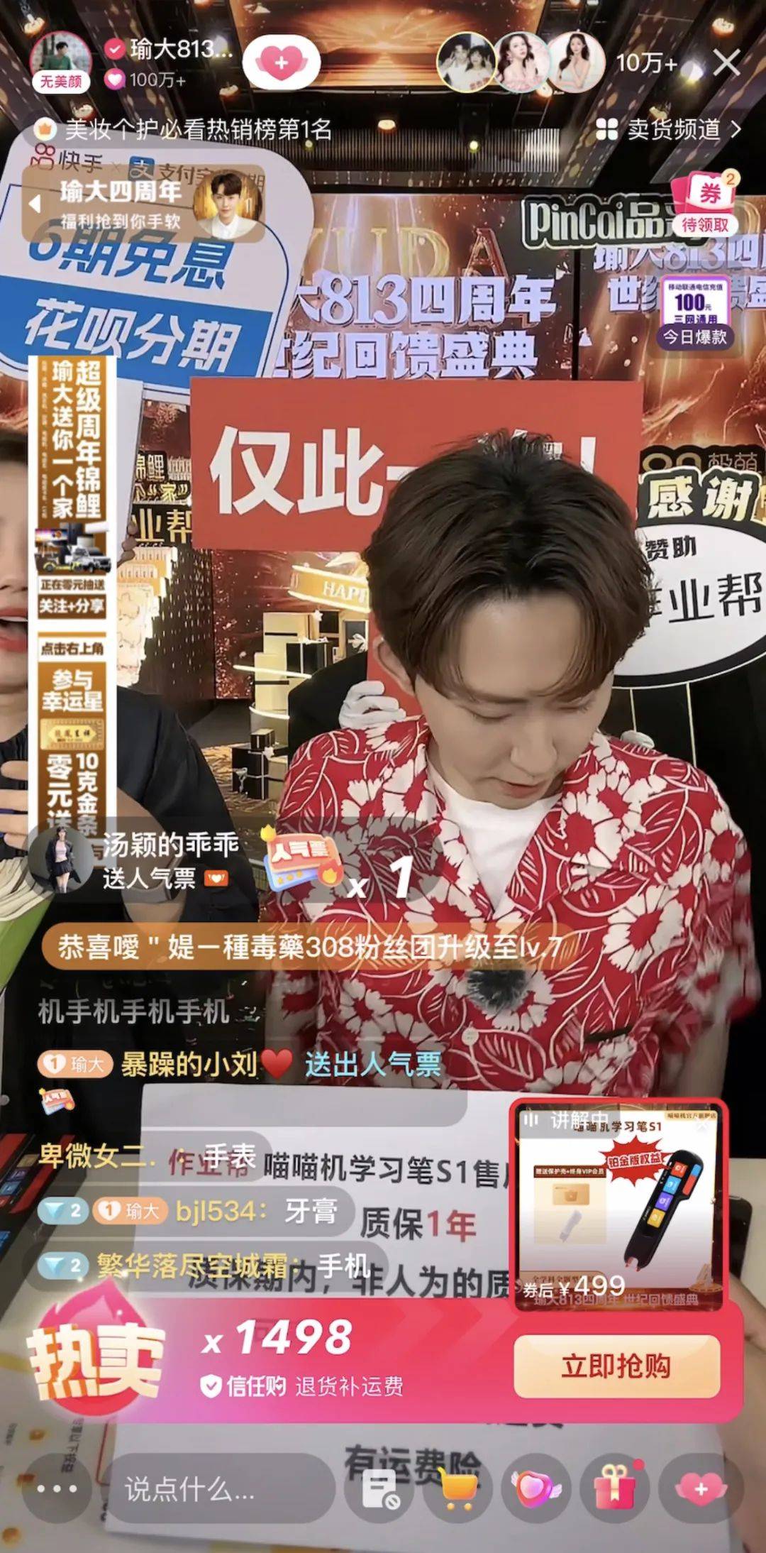 8月13日中午,“踏光而来,放肆宠你”瑜大公子813四周年世纪回馈盛典直播在快手开启。当场直播持续12个小时,品类几乎覆盖了手机、家电、美妆、生鲜、食品、母婴、服饰等等全品类商品。