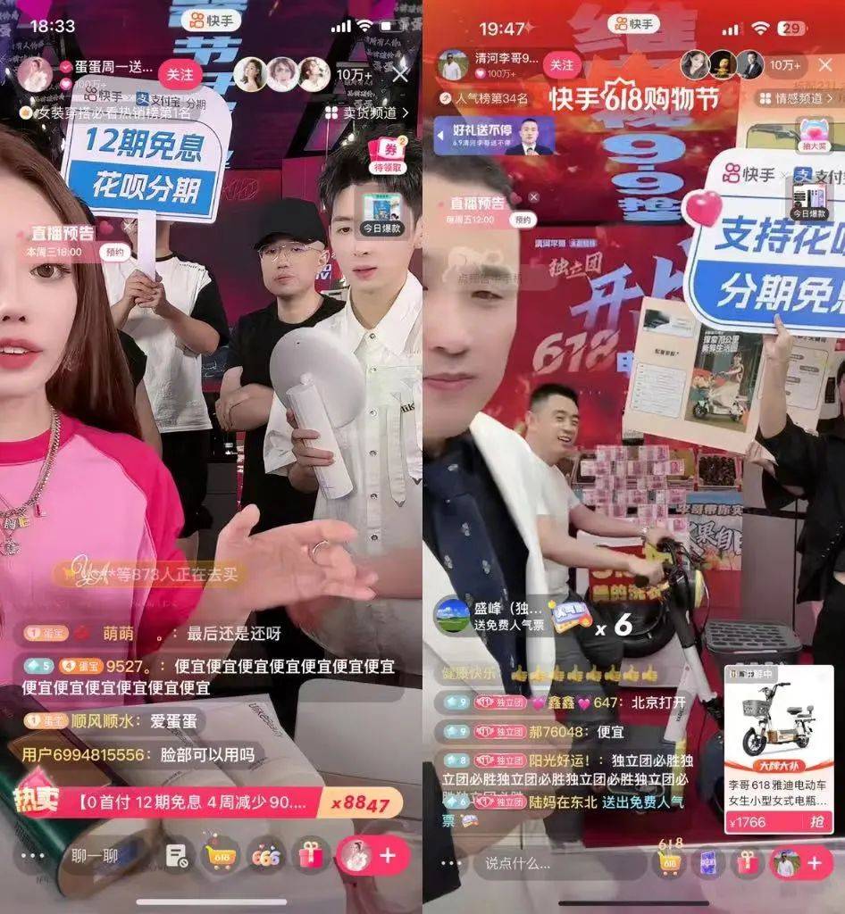 从今年38节期间,快手公布的数据来看,商家GMV爆发迅猛,订单量同比去年提升40%,品牌GMV同比去年提升125%,短视频订单量同比去年提升209%,分期付款GMV同比去年38提升130%;直至今年快手的“618购物节”,分期免息依然是直播间主推的核心玩法之一。