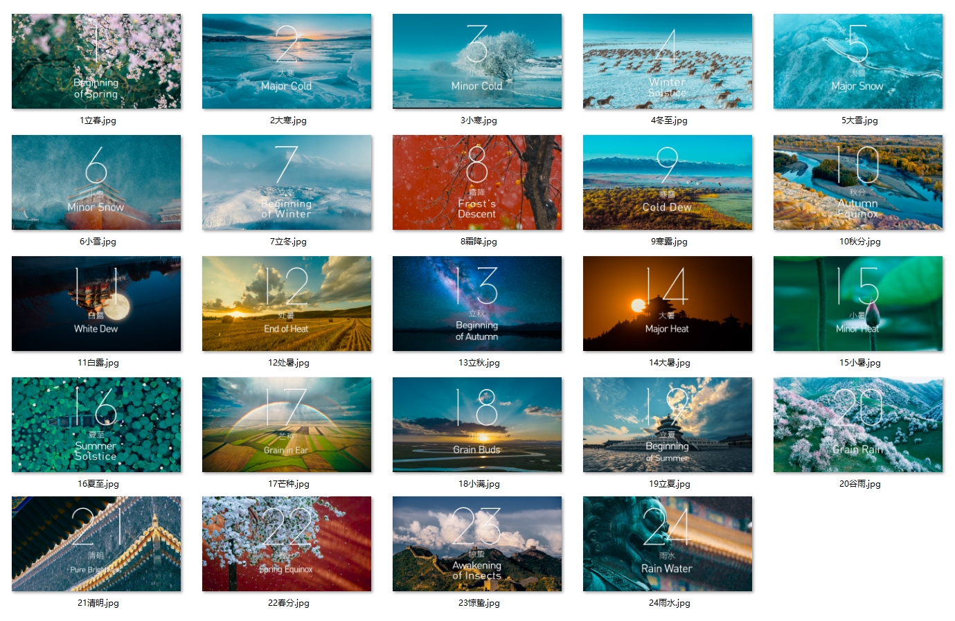 这些图片都是4K分辨率的,无水印,每张图片都精准地描绘了二十四节气中的一个节气的特色场景。从立春的万物复苏,到清明的细雨纷飞;从端午的龙舟竞渡,到中秋的月圆人团圆,每一个节气都有其独特的韵味和风情。这些壁纸图片以中国传统美学为基础,结合现代设计元素,通过细腻的色彩和光影处理,将二十四节气的美丽瞬间定格成永恒。