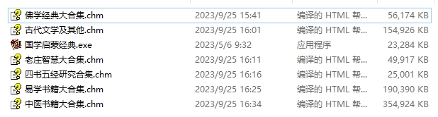 这是一套非常非常强大的国学资源书籍,一共7个文件,但是内部却像一个图书馆一样,简直就是一个超级书籍库。这些书籍是chm和exe格式的,只能在Windows电脑上阅读,全部都是静心制作的,包含的内容非常的多,这些内容多数已经是绝版的了,这套资源是个人收藏压箱底的东西,准备永久珍藏到地老天荒的,现在拿出来分享给喜欢这类资源的朋友。