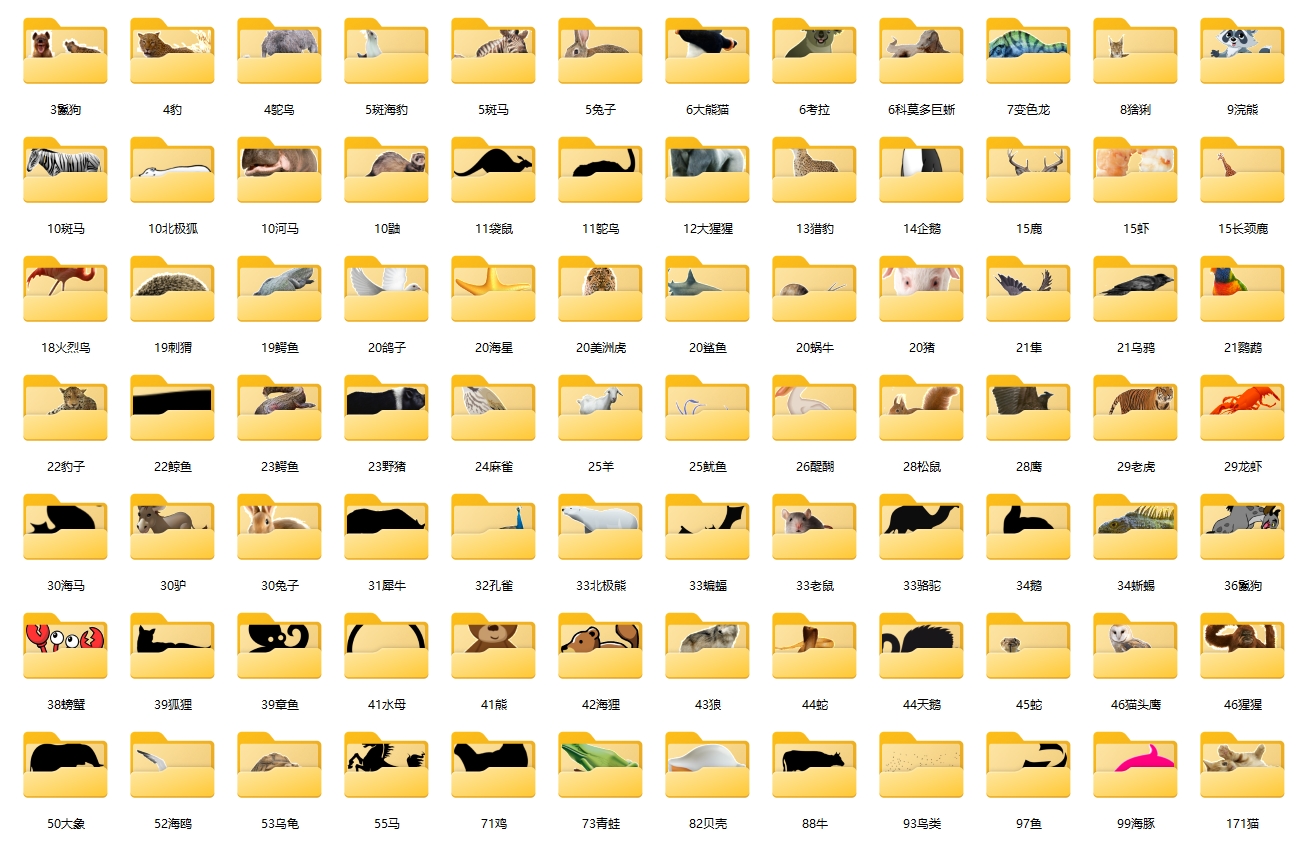 这是目前收集最全的一套动物免抠图素材,新老鸟虚拟资源网的图片素材非常多,基本上都是一整套一整套分类打包的,本次的这套动物免抠图绝大多数是png透明背景格式,全部进行了精分类,一种动物一个文件夹,方便你在使用的时候可以直接按动物类型选择使用图片,每种动物都有很多图片可以挑选,这种资源的好处是你不需要到各大图片网站一张一张搜索了,整个资源包7G左右,下载后直接扩充到你的素材库,随用随取。