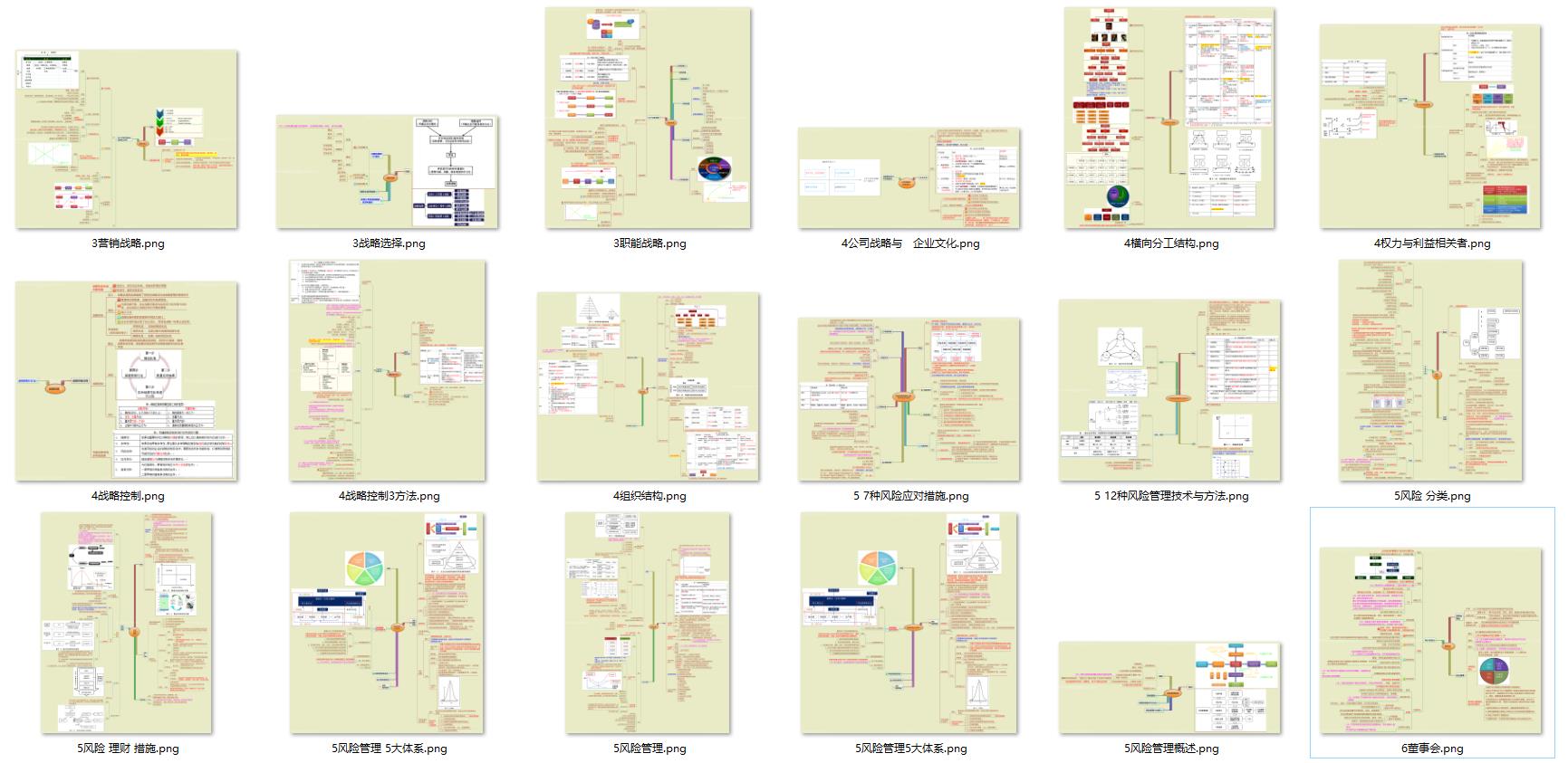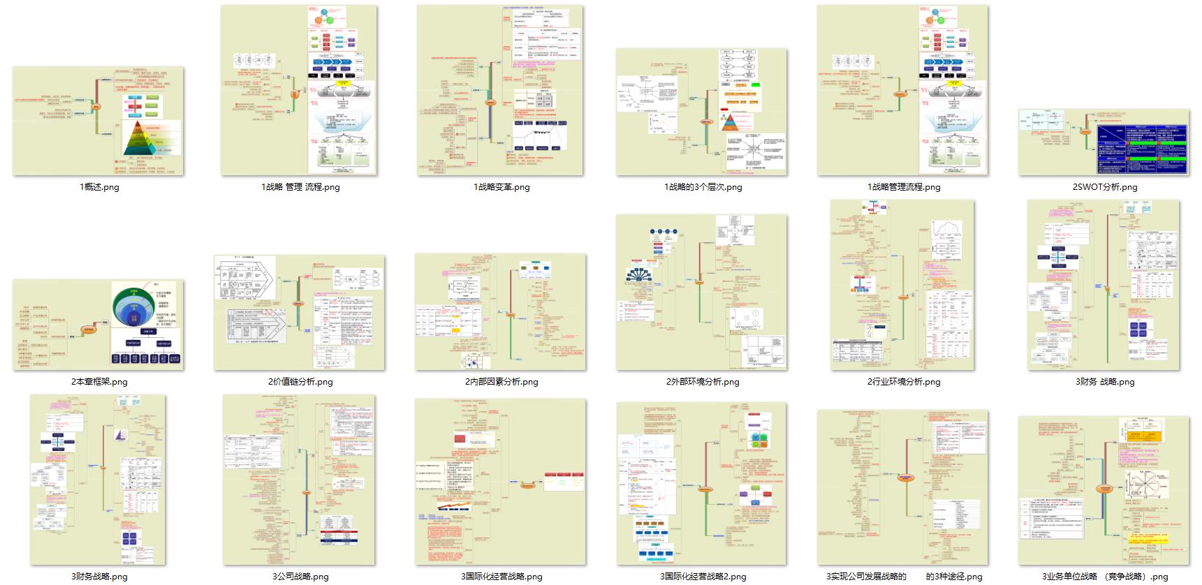 这套企业战略级思维导图的制作确实是用心了,内容涵盖面广,做工比较精细,认真的学习能够学到不少经验知识,一共40多张,大体上围绕企业发展的各个方面进行展开,各种坑和战略方向都有写。jgp格式的图片,直接打开可放大学习。