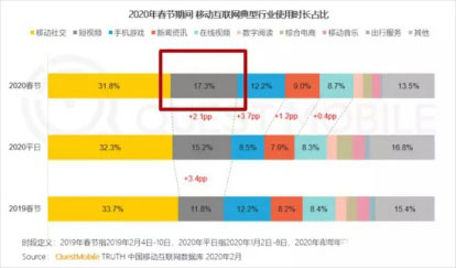 而根据quest mobile发布的《2020中国移动互联网“战疫”专题报告》,能够发现在疫情发生的这段时间里,短视频的使用时长占比达到了17.3%,位居第二位▼