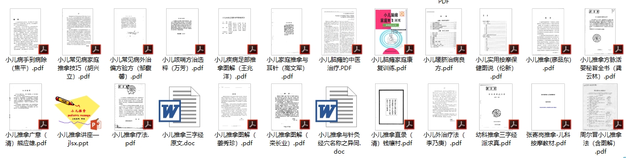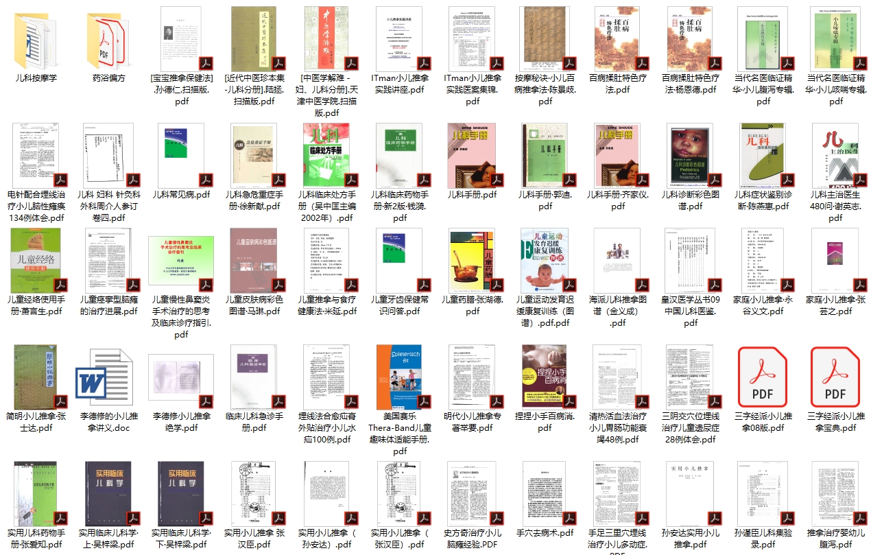 一套比较专业的中医儿童小儿推拿类的资料,大多数都是电子书籍,这些电子书籍里有大量小儿推拿的经验技巧,还有关于儿科按摩学的资料,除此之外还有很多中医、针灸、小儿百病的认识和处理方式,对这方面感兴趣或者从事这方面的可以学习学习研究研究。中医这几年有点没落,现在很多情况下都是直接西医解决,比如儿童病了都基本上先去拍个中片子,然后各种西药,消炎药之类的,即使是传统的中医药也基本上是这个流程。不过我相信老祖宗的东西应该还是有很多是有用的,只是传承的过程中淡化了,或不被重视了。