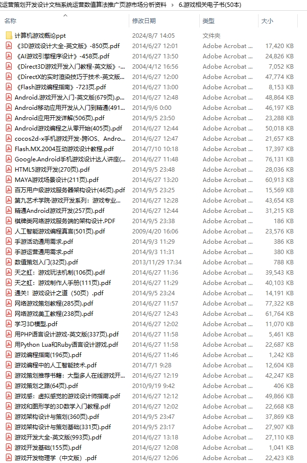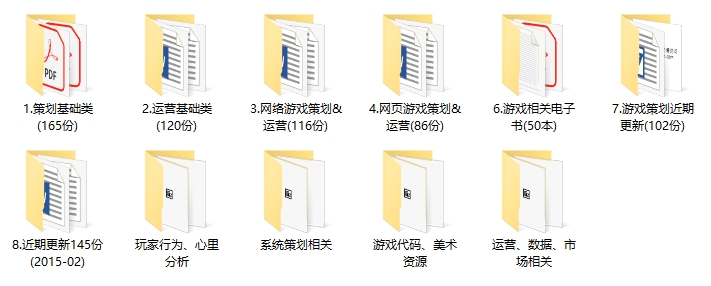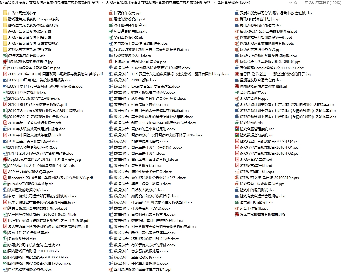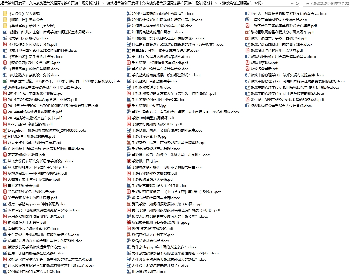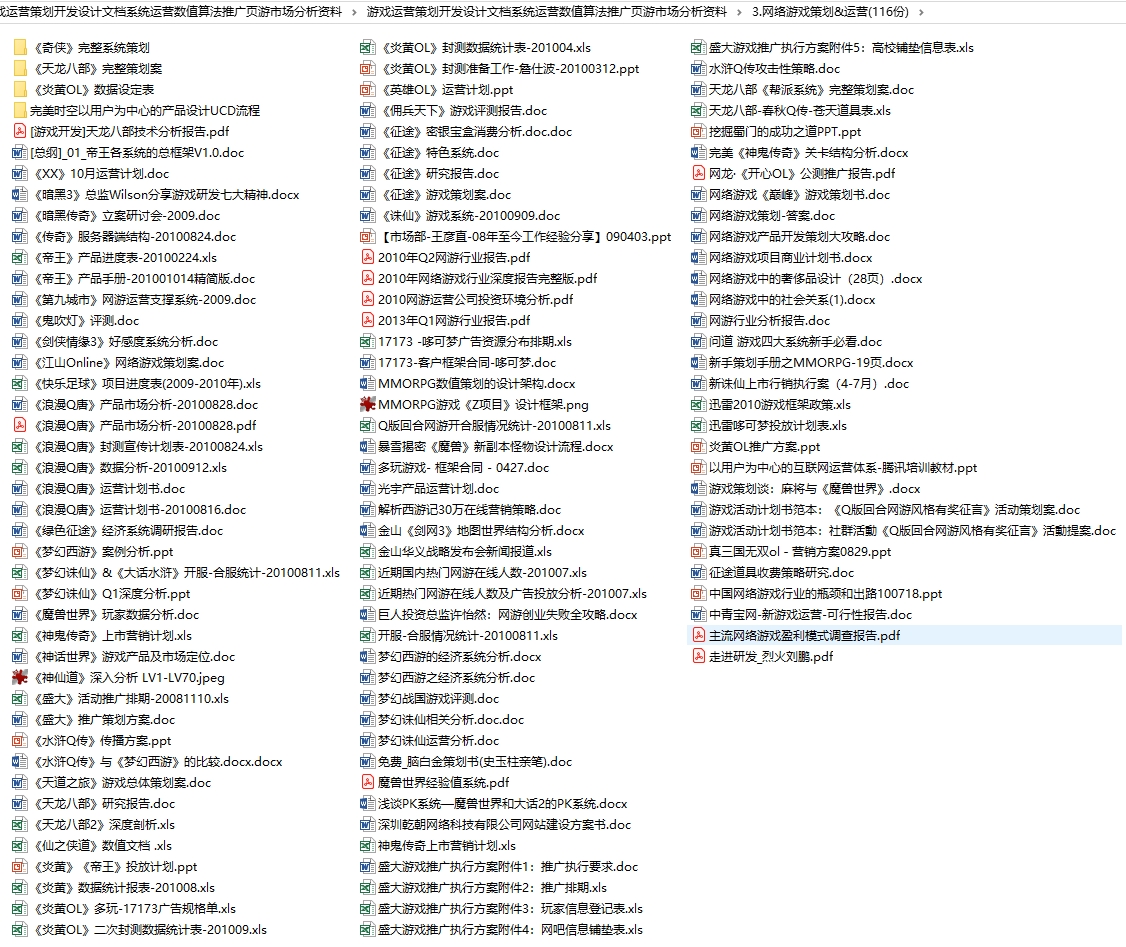 这套资料是关于游戏运营的,内容比较多,可能不是时下最新的游戏,但从这些游戏中摸出个大框架一点问题都没有,要知道很多游戏大脑就是从过去的经验走到现在的,而这些资料就是过去的经历,很多游戏我们都玩过,这套资料可以让你了解这些游戏的发展过程和背后的运营逻辑。