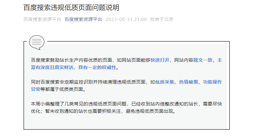百度在八月三十一号九点发布了关于 《百度搜索违规低质页面问题说明》 ,然后随之而来的就是大批量的站点被百度评为低质量站点,并且纷纷被百度站长平台删除使用权限,甚至是多年的企业老站也没能幸免于难,当然这里也不排除是被误伤的可能,毕竟这么大范围的整顿,很难保证没有误伤的风险。