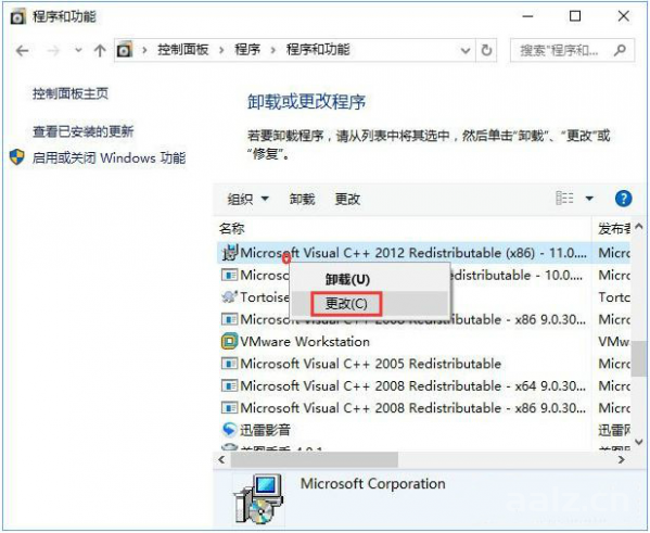 3、在弹出的卸载界面如图找到找到vc++,然后右键单击选择更改选项。