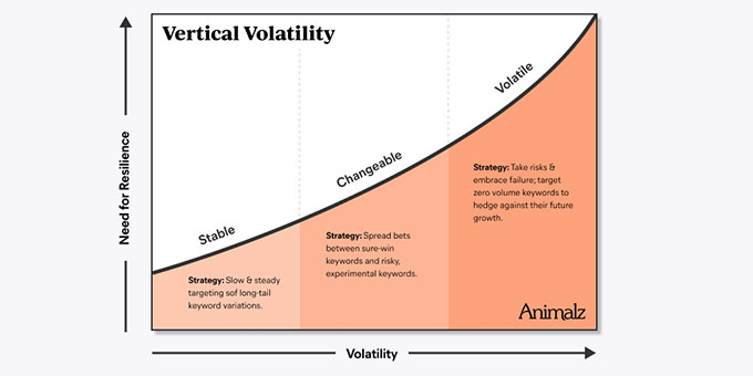 我们使用垂直波动率模型帮助我们绘制出我们的行业在这个范围内的位置。就像金融中的波动率模型允许投资者预测变化的可能性并相应地修改策略一样,映射垂直波动性允许内容营销人员估计SERP 波动的可能性,并设计一个考虑到波动性的关键字策略。