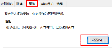 3、接下来在打开的“系统属性”窗口中,切换到“高级”选项,并点击下方第一项“性能”右侧的“设置”