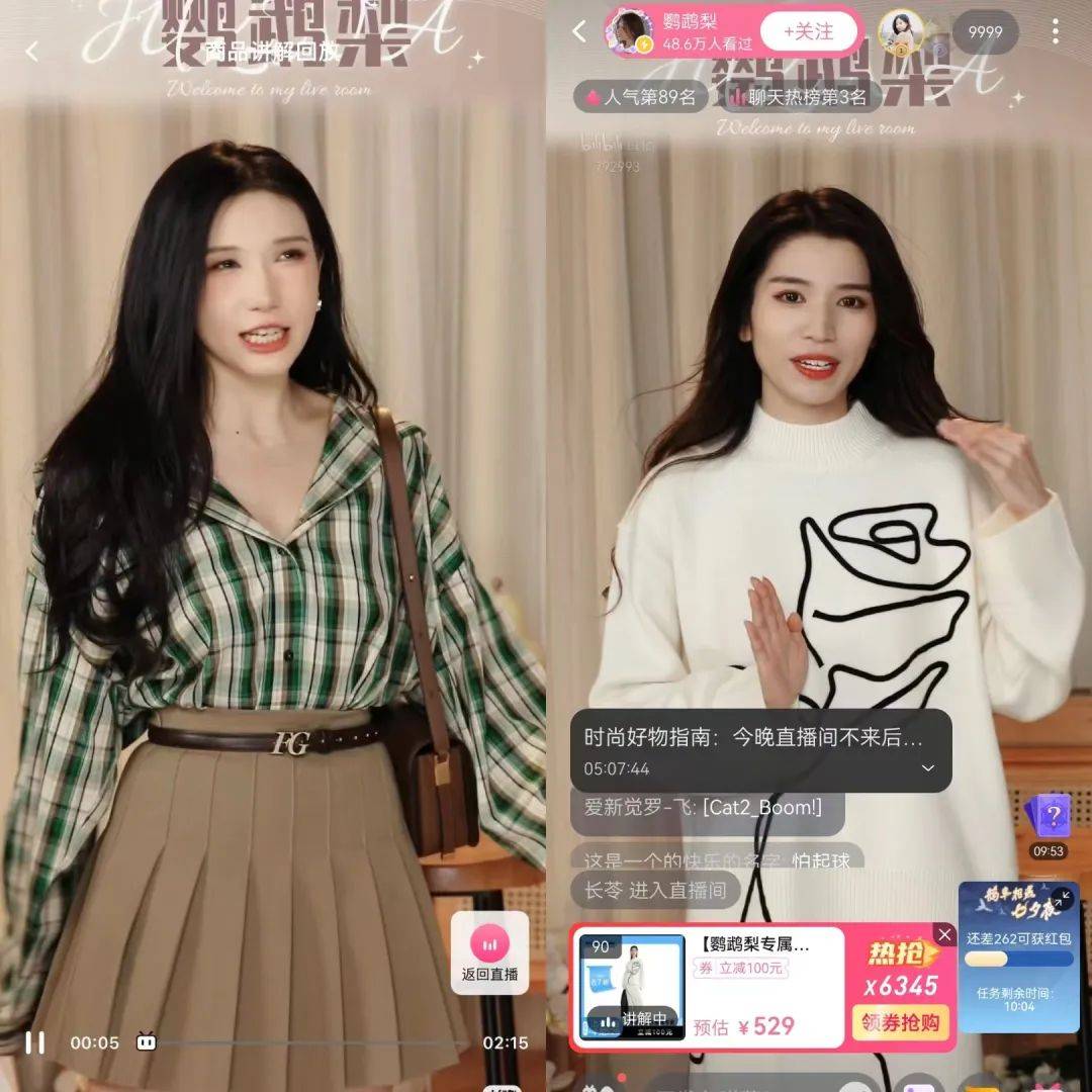 这称得上是一场精心编排的直播。预热期间,为了避免因长相和气质造成观众对衣服版型的误判,鹦鹉梨制作了一期直播产品整合视频,将直播清单上的产品做了“不露脸”式穿搭,以平时拍摄的角度直观地展示给观众。