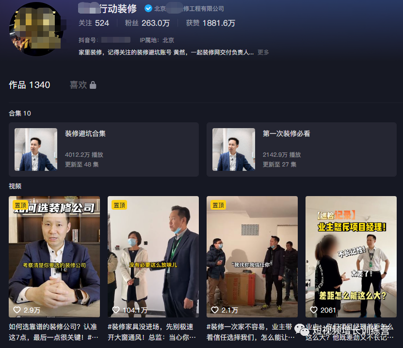 账号主页:发布装修案例、设计理念、施工流程等内容。同时也可以发布一些有关装修小知识或者装修技巧的视频,增加用户对于该账号的关注度。特别是有一些装修季或者有新的装修风格出现时,及时发布相关内容,吸引目标用户。