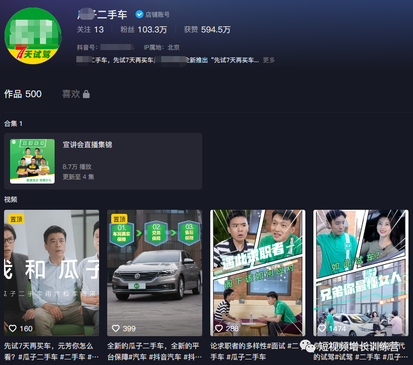 账号主页:发布二手车信息、价格评估、车辆维修保养等内容。同时也可以发布一些有关汽车文化或者汽车旅游的视频,增加用户对于该账号的关注度。特别是有一些重大汽车事件或者新车发布会时,及时发布相关内容,吸引目标用户。