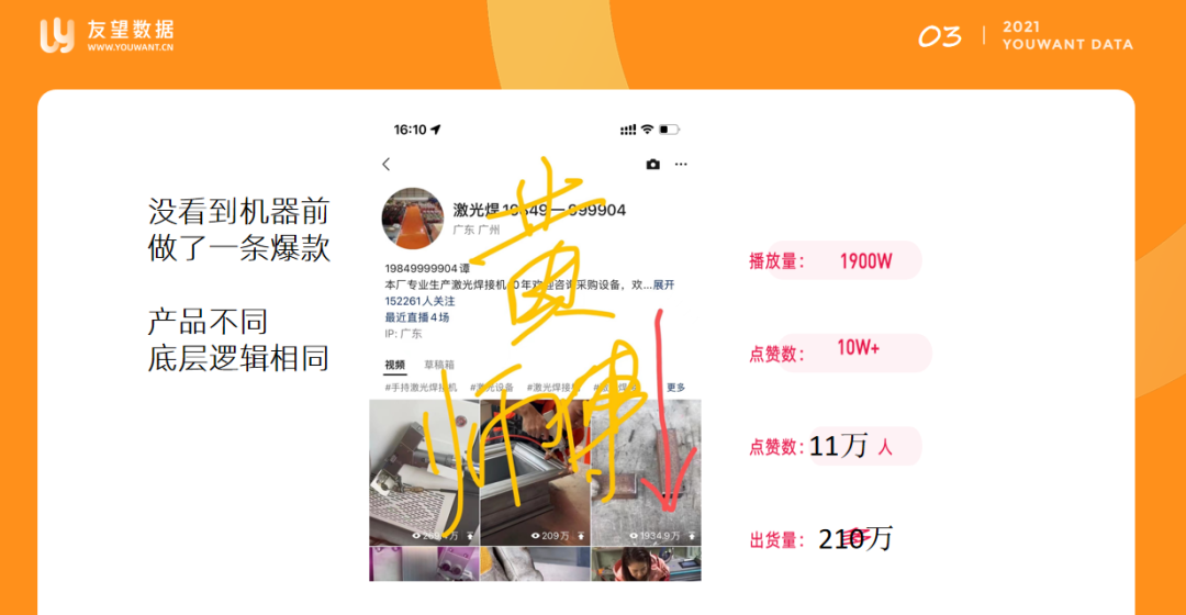然后我们开始找对标的账号,当时我们找的一个竞争对手,是在佛山的一个叫安第斯的激光设备厂,他们一年的时间,去年赚了3600万,这是我们内部的数据。