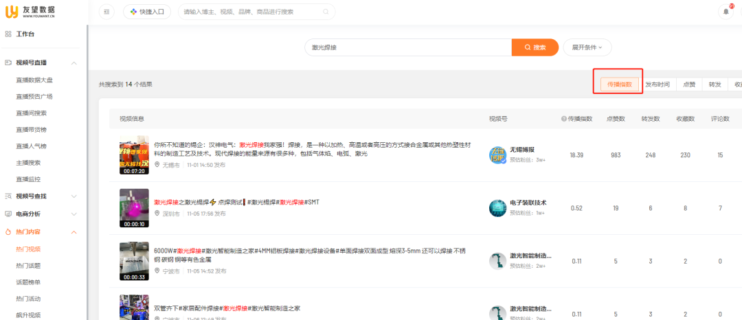 然后我们在第三方的数据平台,比如说友望,输入我们的关键词激光焊接,搜索看到里面传播指数比较火的。