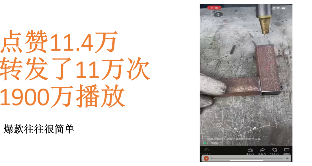 目前在视频号能够快速爆流的视频,基本上都是在25秒以内的,所以我们就很看重短频快的视频,前三秒的素材是怎么样的,是如何吸引眼球,那中间六秒我们来做一些解构,如果是我们激光设备,我们就知道说,它中间六秒它是做了一些加速,然后在焊接的过程中非常的顺滑,而且焊接出来是没有任何焊渣的,那这些东西是用户所期待的。最后是收尾阶段,就是我们展示出来这个产品使用的效果是怎么样的,比如焊完之后整个焊缝非常的美观,无需打磨,这些都是用户想要的。