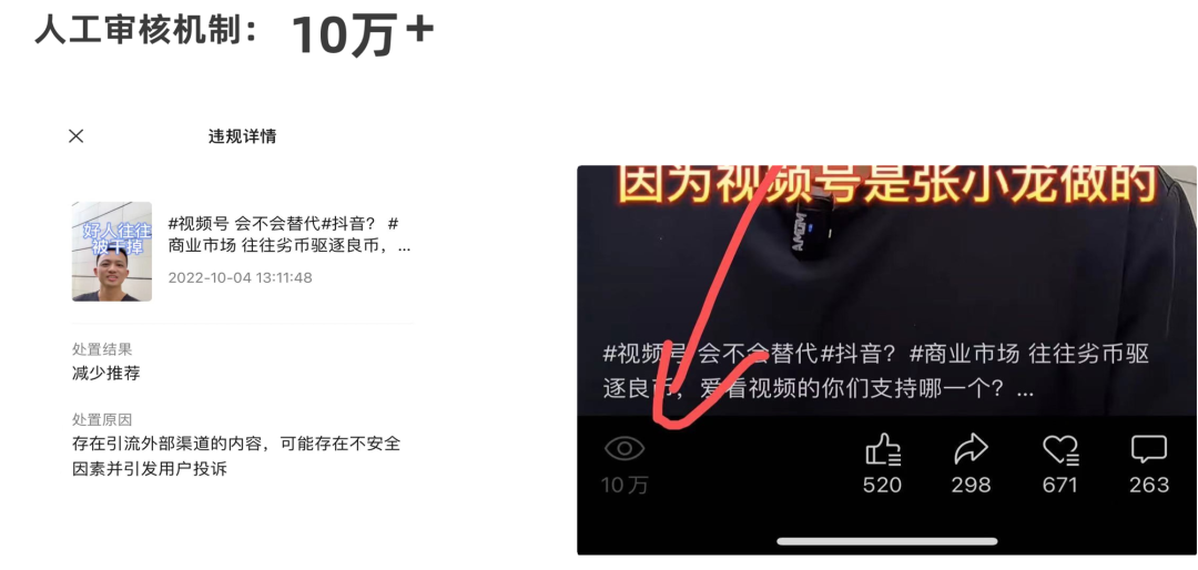 下面讲一下视频号的审核机制,我们讲一下限流的三个层面。一个是基本面的限流。第二个是营销面的限流,就是强营销内容,比如说培训,时总会,价格,案例这些,那强营销跟弱营销的内容的播放量的话是差别很大的。还有还有数字的内容,比如说第一名卖了多少多少,这些有数字的内容都是比较容易被限流的。