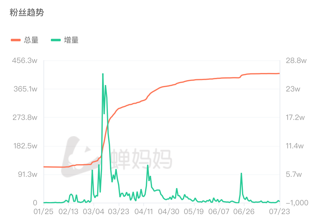 @大劳R 是抖音上一位 416 万粉丝的搞笑博主,今年开始抓准了“啃老”的流量密码——视频开头几乎都以一句“妈”开头,内容主要是跟妈妈的拌嘴日常。今年以来账号涨粉超 300 万,3 月单月增粉 190.8 万。