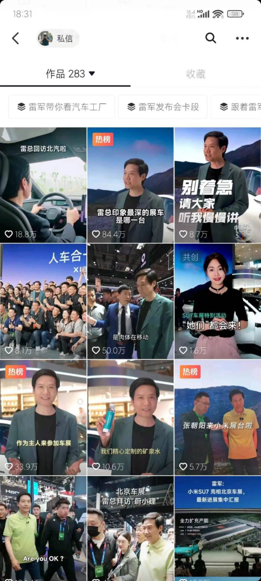 视频内容也更丰富,既有演讲切片,也有驾驶道路测试,还有逛展 vlog。其中一条视频更是直接在开头接入粉丝对雷军的亲切问候“Are you OK ?”,对老板“贴脸开大”,娱乐效果拉满,单条视频获得了超 170 万网友点赞。