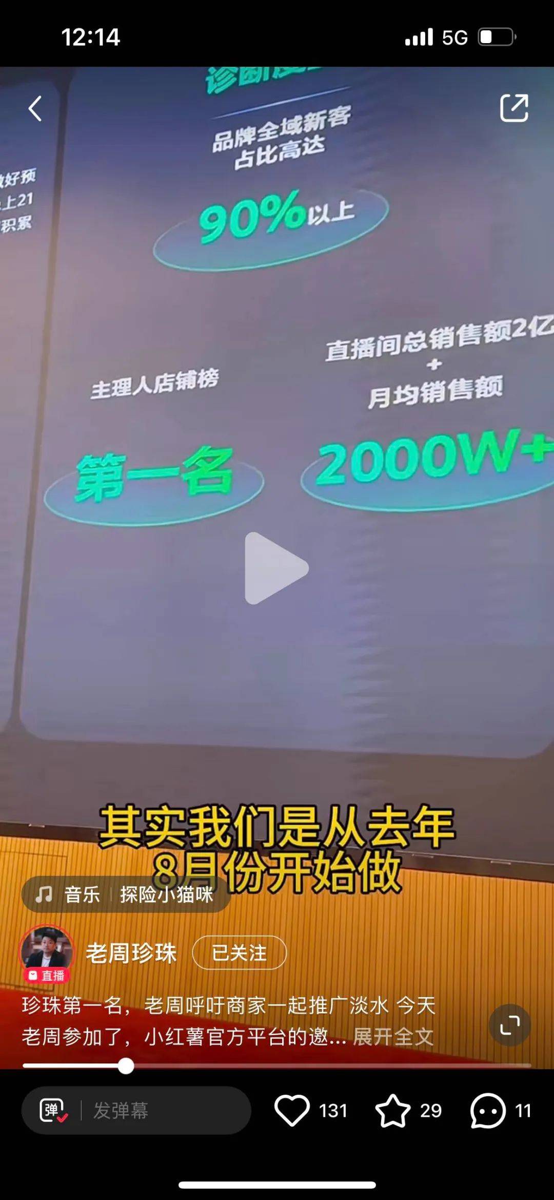 小红书博主 @老周珍珠 是老版卖货的典型代表。在小红书,他凭借老板人设吸引了 5 万粉丝,将直播间搬进工厂,一年卖珍珠销售额达到 2 亿元。