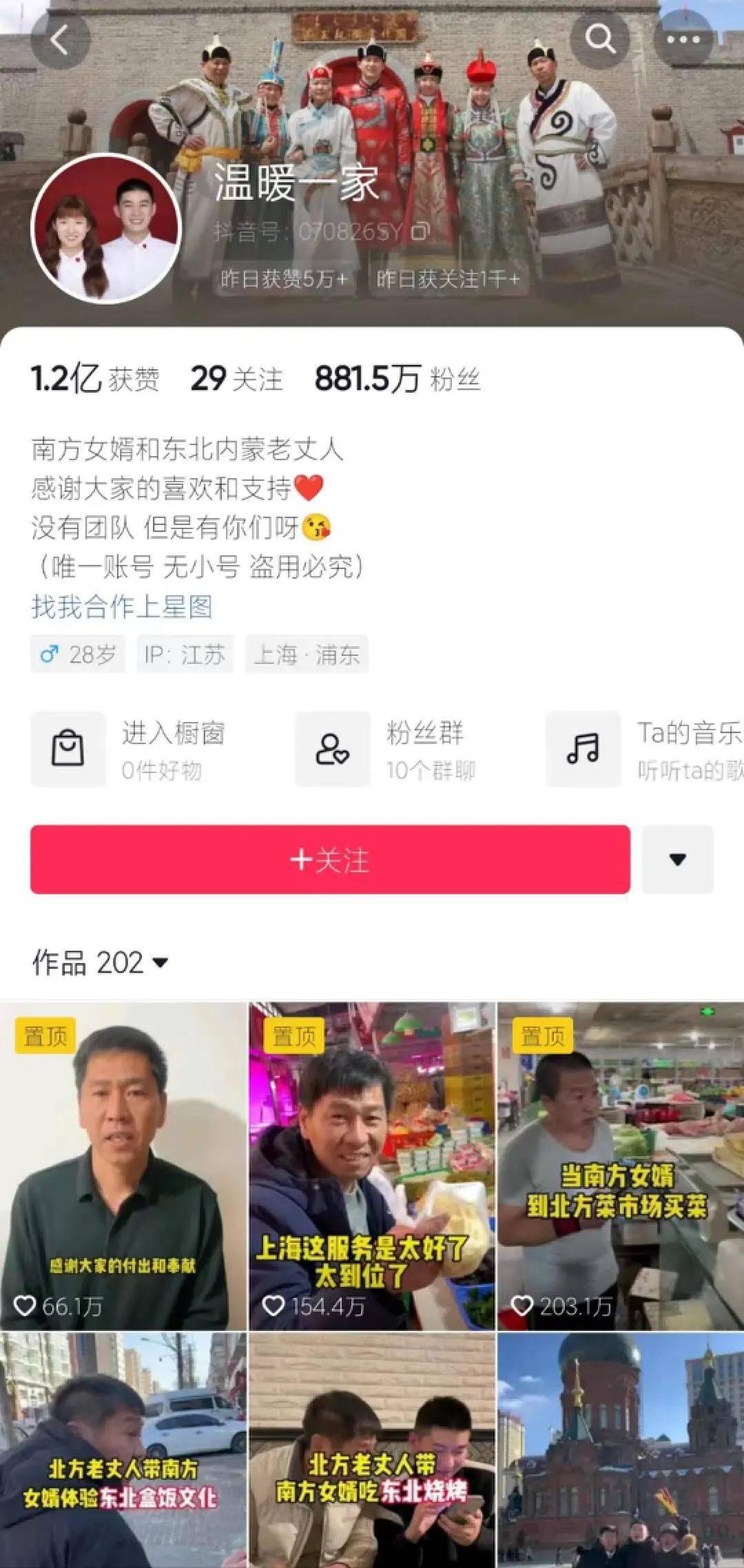 这个来自上海的女婿,通过账号@温暖一家,记录了他东北内蒙古老丈人的日常 vlog ,吸粉 886 万。