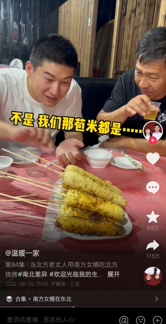 让@温暖一家 彻底爆火的是一条名为“当北方老丈人带南方女婿吃北方烧烤”的内容。视频中,老丈人小福带着女婿佳辉在东北吃烧烤。