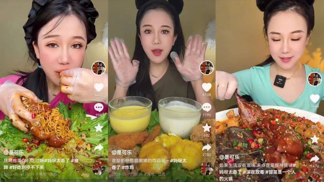 其三则是爽快的人设。走进@是可乐的直播间,最为直观的感受就是热闹与快节奏,主播爽利的口播与毫不拖泥带水的吃播,构成了最为直接的感官刺激。而夸张的吃相、标志性的倒八字眉也让她有了更多记忆点。