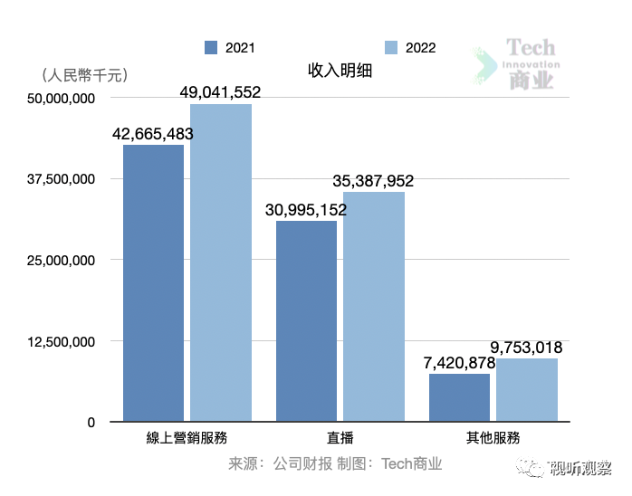 根据快手2022全年财报,2022年快手总收入942亿元,线上营销服务收入为490亿元,直播收入为354亿元,其他服务本财年收入为98亿元。仔细阅读就会发现,这里的直播收入基本上就是指娱乐直播收入,约占总收入占比达到37.6%。
