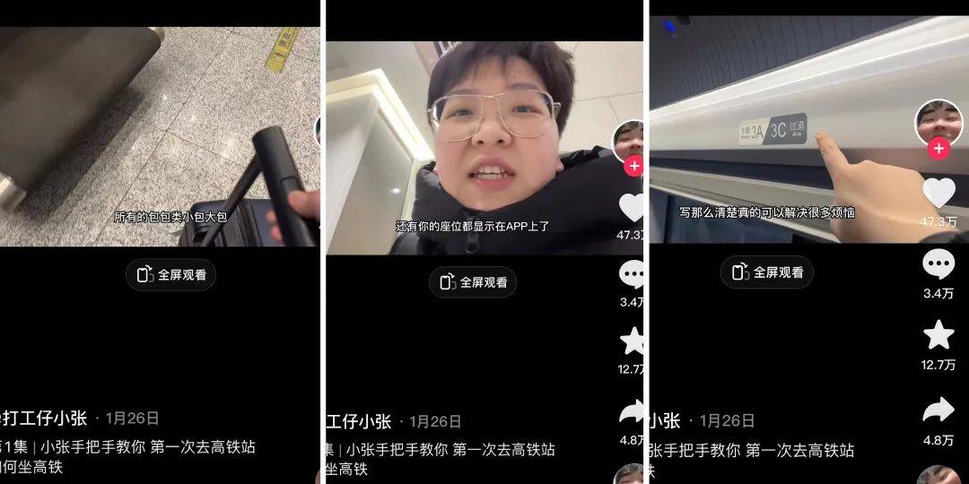 今年1月26日,小张发布了一条《小张手把手教你第一次去高铁站如何坐高铁》的视频。视频中,正好要乘坐高铁返工的小张一边记录着自己坐高铁的全过程,一边事无巨细地向用户讲述着每个流程的具体步骤,从提醒大家要提前半小时到达高铁站到行李安检、取车票、找候车室位置、去相应候车室等待检票、检票入站、寻找车厢、入座,在她的沉浸式讲解之下,整个过程一目了然。