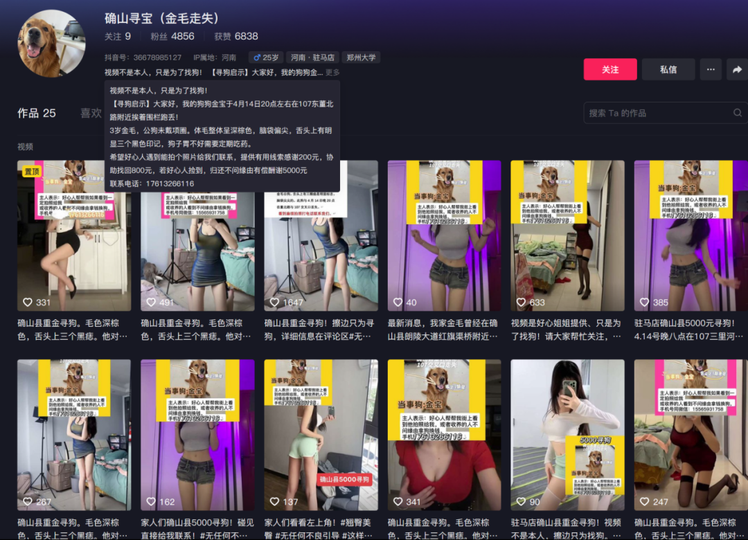 以6月份被很多网友刷到的“刚子妈”为例,主播一开始借着寻狗的名义发布内容,上传的也是简单的图片文字视频,十分朴素。但是寻狗没多久,主播开始真人出镜了,她的寻宠视频长这样: