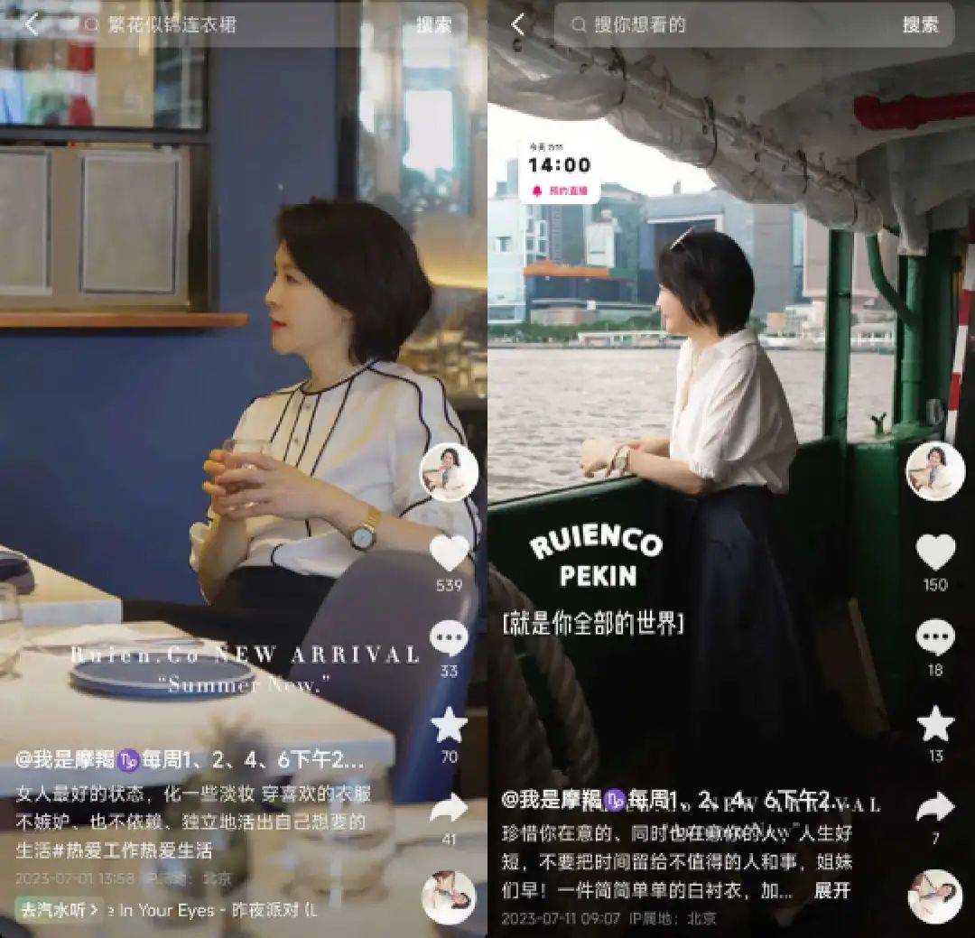 观察“我是摩羯”的抖音账号可以发现,视频并不仅仅是在展示服装,而是通过高频、简短的生活片段展示,还原出一种休闲、松弛、有气质的生活氛围。