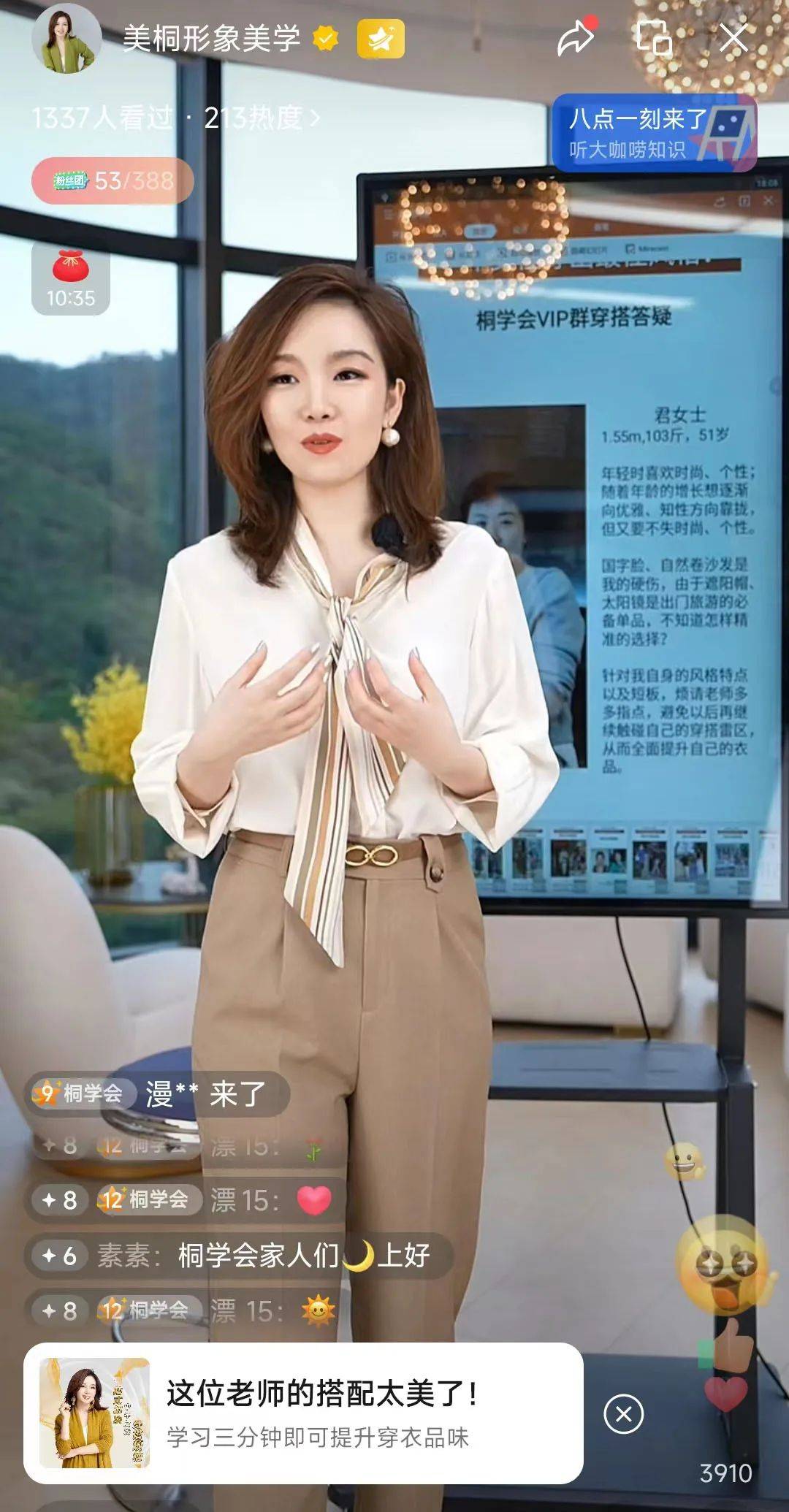 观察“美桐形象美学”的直播可以发现,与常见的叫卖式直播不同,她的直播节奏更慢,相比价格优惠等促销话术,她更常说的是“夏天鞋子如何搭配裙子”等穿搭知识。相比卖货,“美桐形象美学”更像是在上课,是在教直播间观众如何变美。