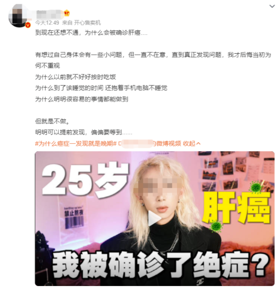 最近,网红博主@金洋Jyan 推出了视频《为什么癌症一发现就是晚期》,内容中宣称自己确诊肝癌,化验单、抽血画面让人信以为真,视频播放迅速超过2000万。