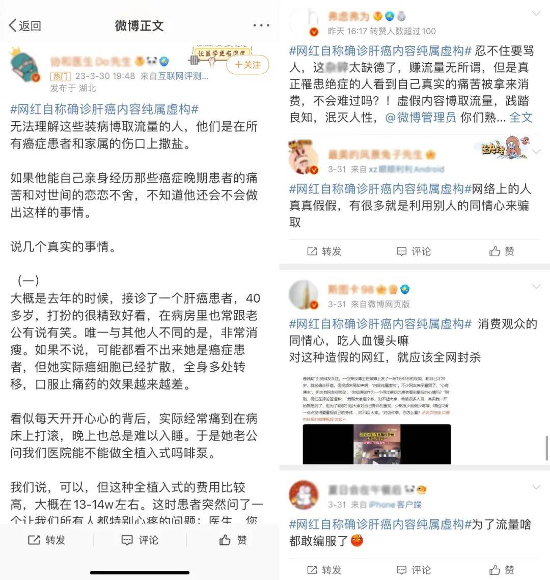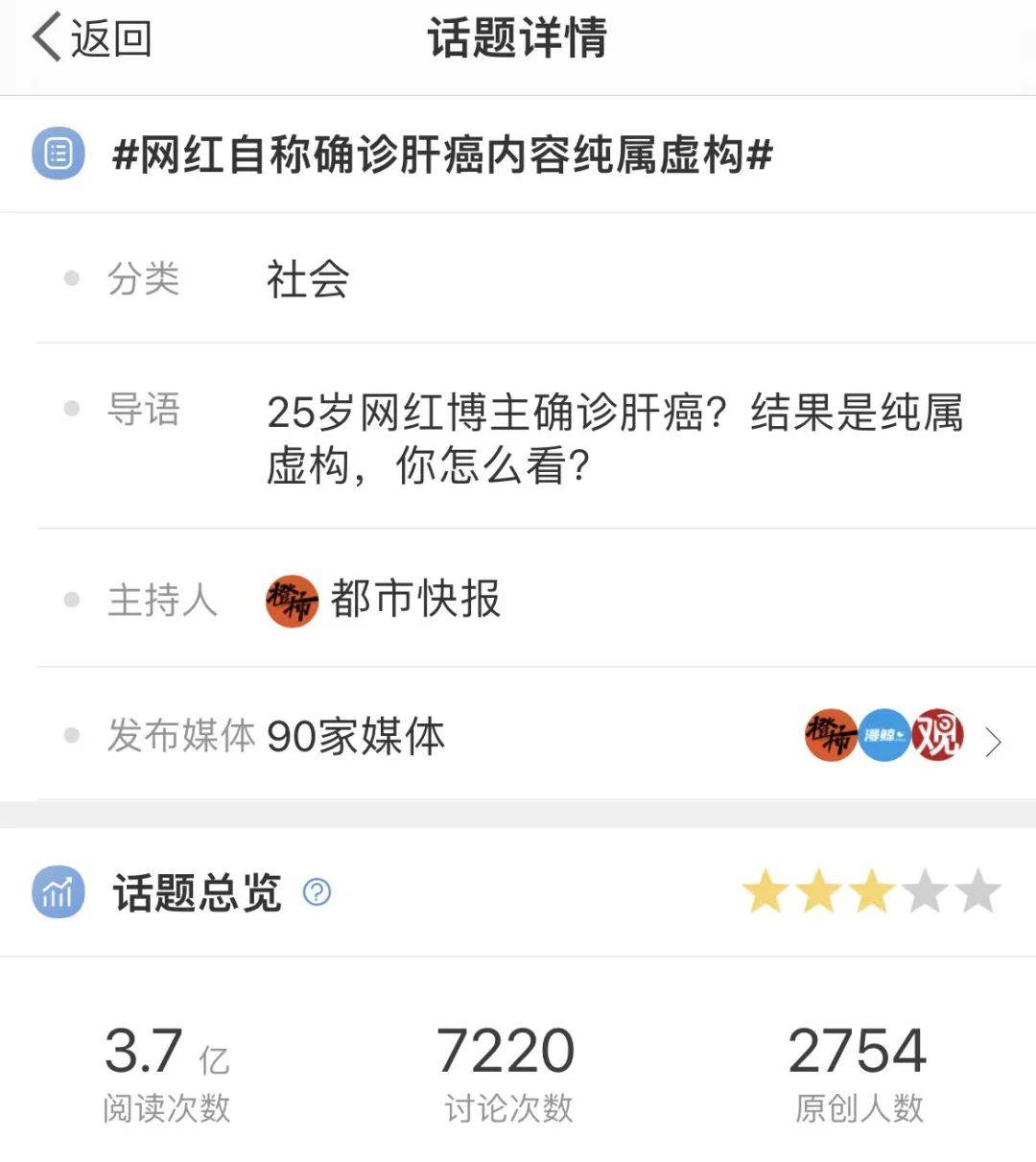 虽博主在面对争议时,删除了内容 ,并对于社会造成的不良影响进行了道歉,但网友似乎并不买账,#网红自称确认肝癌内容纯属虚构#登上了热搜,产生了3.7亿次阅读,7000次+讨论。