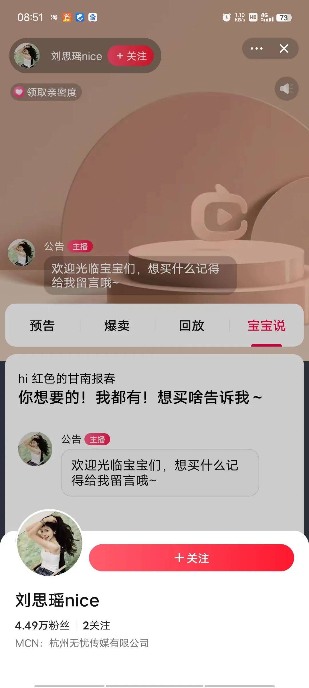 根据“极点商业”最新查验,刘思瑶淘宝直播间的预告、爆卖、回放、宝宝说都是完全空白——只剩下4.49万粉丝和所属无忧传媒展示。