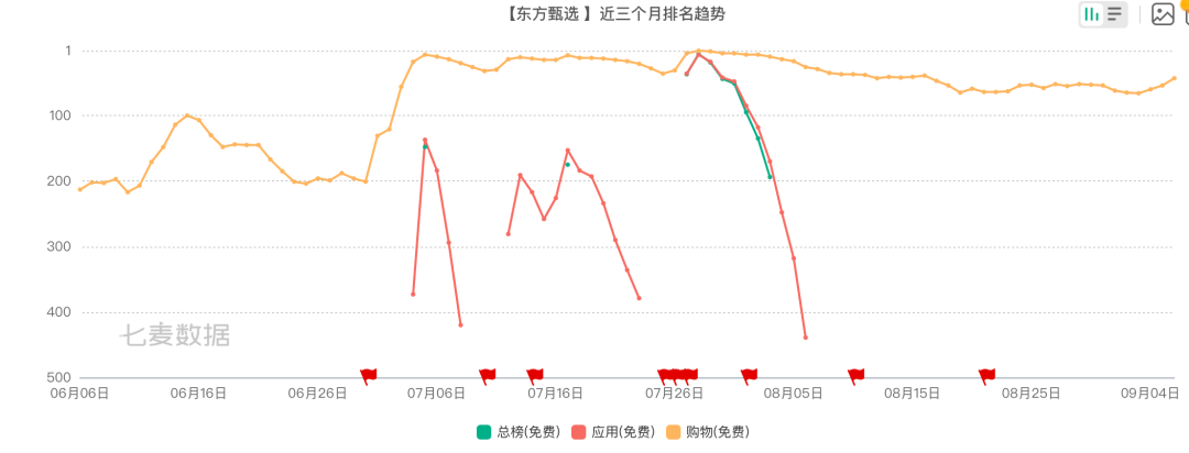 这就是东方甄选独立电商APP,截至目前为止少有的“高光时刻”了。“七麦数据”显示,进入8月后,东方甄选在iPhone端购物(免费)细分类的下载量,大部分时间徘徊在40-70位之间。