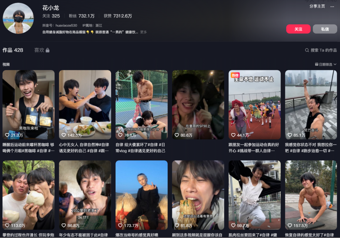 这个@花小龙 也很火,靠自律减肥抖音一周涨粉30w+,目前,其总粉丝数已经超过700万,是实实在在的健身大V。@花小龙的抖音日常,就是记录自律的每一天,在贾玲看来,其账号的特点在于精神状态,一直元气满满,是“情绪引导者”,让减重的路上变得不那么枯燥乏味。