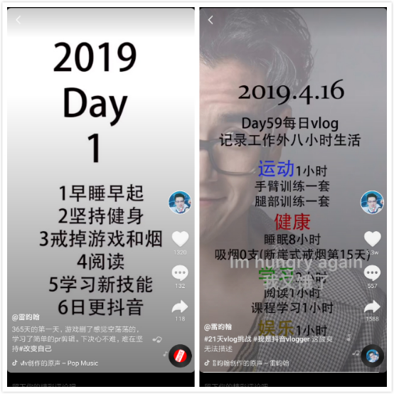 关于自律学习,一位账号名为@雷昀翰 的用户,从2019年1月1日开始,就发起过“365天自律挑战”,将自己上班8小时外要做的事情与必须达到的目标贴图到自己的vlog中,同时将视频剪辑将自己的经历展现在视频中,最后对自己的一天进行反思,完成打卡。累计收到了470.3万点赞与近百万粉丝,被网友们称为抖音短视频平台上的自律达人。