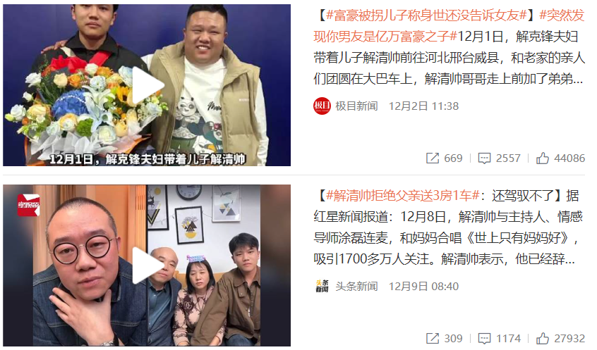 因为本身的话题度高,从12月1日解清帅与52岁的父亲解克锋及家人相见的当天,河南广播电视台都市频道就开始在抖音平台直播整个过程。类似“河北亿万富翁寻子成功”的话题冲上热搜榜单,很多网友开始关注解清帅及其家人的抖音账号。