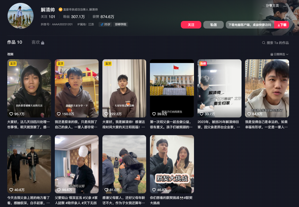 这个寻求的事情如同也一个“流量富矿”,不仅解清帅在网络上有抖音,他的父母、哥哥、嫂嫂、妹妹等人的抖音粉丝数也出现暴涨,逐渐形成了自己的流量IP,一家人的动态不断被推上热搜榜。