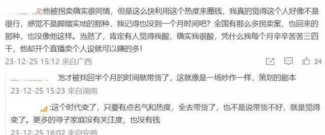 另一部分网友的言辞则更为尖锐,直接指出“原以为找到了家人,原来是找到了家人们”“说白了就是红了捞一把”,甚至有人认为寻子这件事是个彻头彻尾的骗局,目的就是为了博取流量带货。