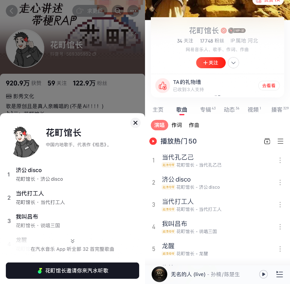 据了解,“花町馆长”不仅是一个影视号创作者,他的个人原创音乐作品也会发布到几大音乐平台上,热度高的作品还能获得版税收益,借此打开了个人IP在音乐圈子里的影响力。