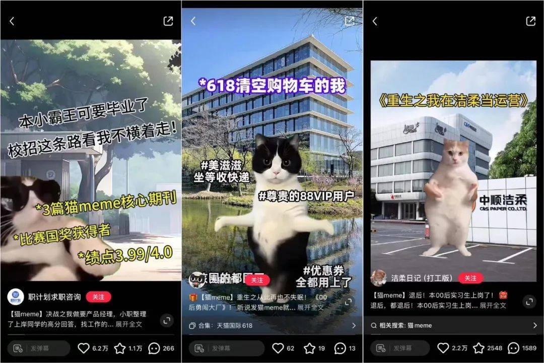 部分官方账号的猫meme整活视频截图