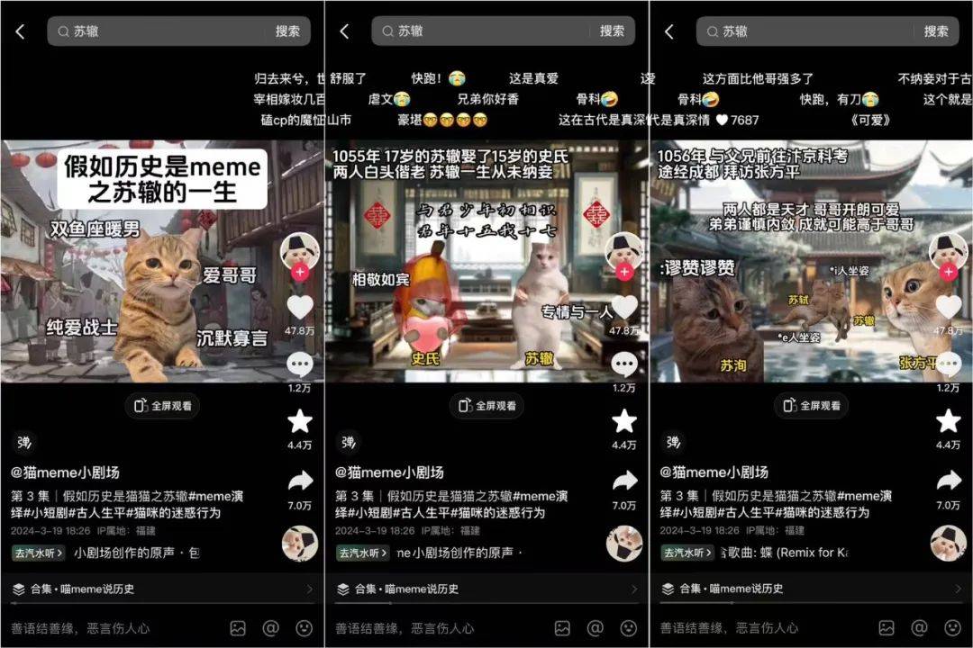 比如,抖音账号@猫meme小剧场 ,过去也是利用猫猫表情包做短视频,但水花并不大。3月初他及时把握住这波热度,做了《假如历史是meme之xx的一生》系列短视频,用猫meme做主角向大家科普古代名人的生平,被很多网友盛赞是真正的寓教于乐,账号也由此收获了远超往常的热度。