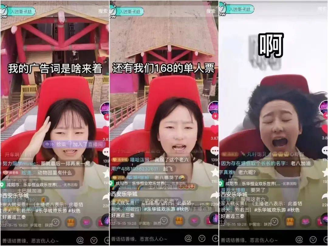 去年9月,由@西安乐华城引领的“第一视角坐过山车”风潮席卷抖音,坐上过山车即将冲刺的主播们满脸惊慌,但仍坚持敬业口播,带给用户一场惊险刺激的“云过山车”体验。