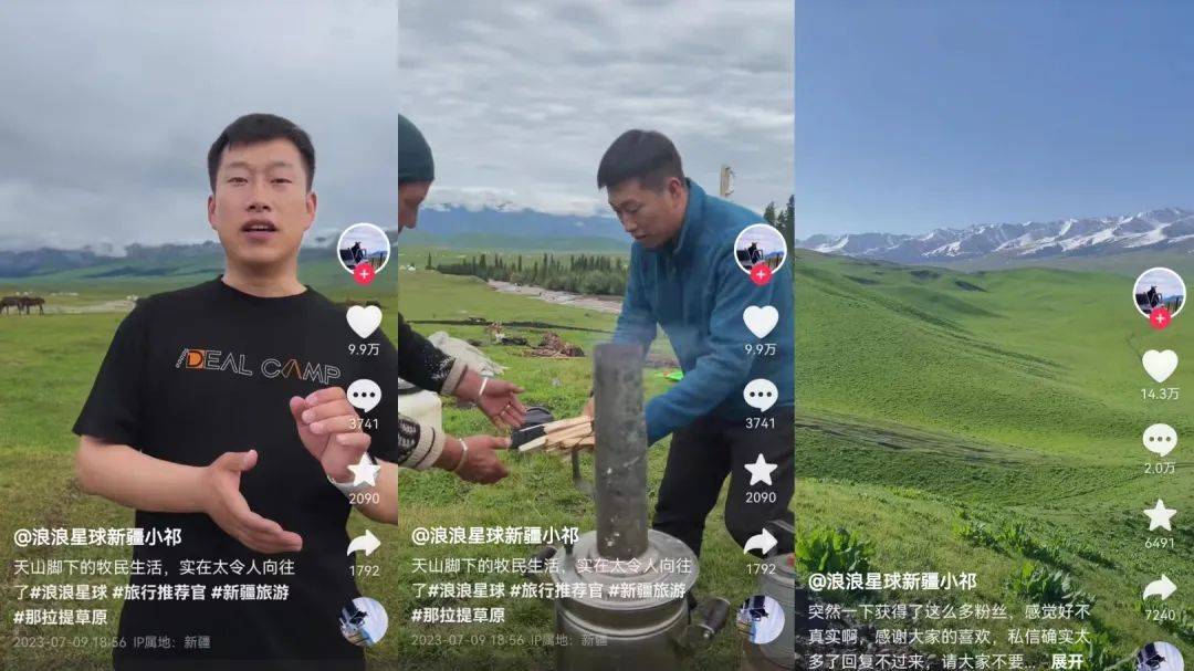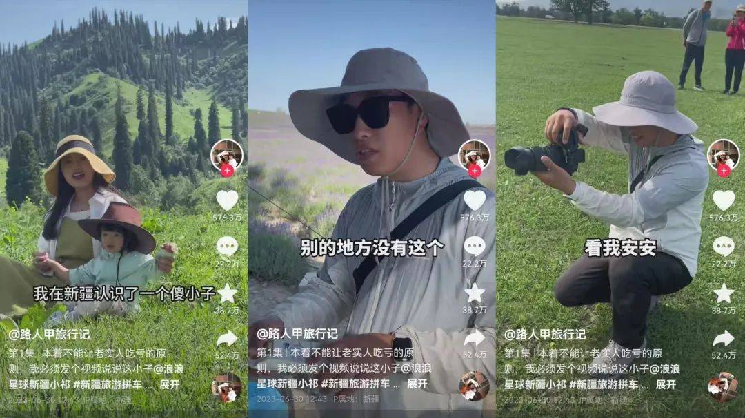 声名鹊起的十多天里,他有条不紊地发布抖音视频,包括送行为他带来热度的@路人甲旅行记、感谢粉丝的喜爱、将父母接来新疆游玩,此后他又迅速回归业务,介绍独库公路全攻略与那拉提草原。