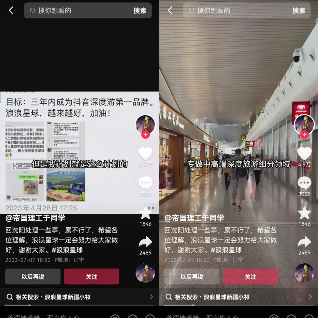 在他的计划中,公司先主打0购物,再慢慢提升服务标准,三年内做成抖音第一深度游。但小祁的出现极大地提高了公司知名度。于同学也趁势推出更多的“小祁”,目前粉丝量较高的有@浪浪星球旅行-于宁、@浪浪星球小袁,从他们的主页中,不时可以翻出小祁的“周边”视频。