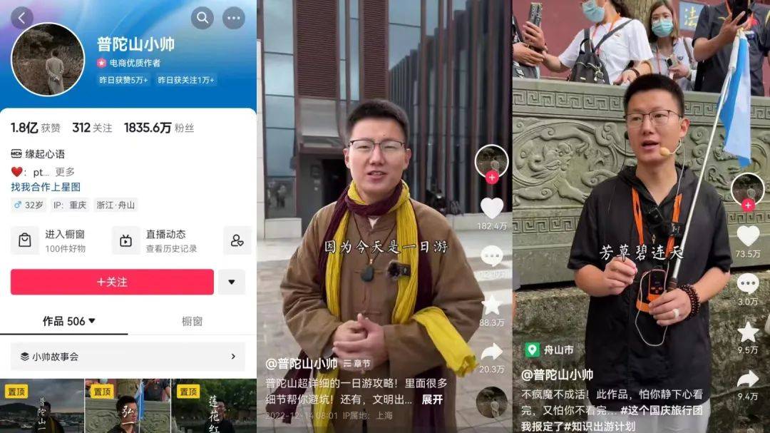 值得注意的是,其从属MCN缘起心语,旗下签约了多名旅行达人,其中粉丝体量最大的为@普陀山小帅,目前在抖音积累了1830万粉丝。观察其内容,他的讲解不仅停留在景点本身,还会进行一些历史由来、趣味故事、意义价值的科普。与MCN主营普陀山不同,小帅的足迹遍布全国,以“云旅游”的方式吸引更多兴趣用户,且会在橱窗中售卖玉牌、手串等产品。