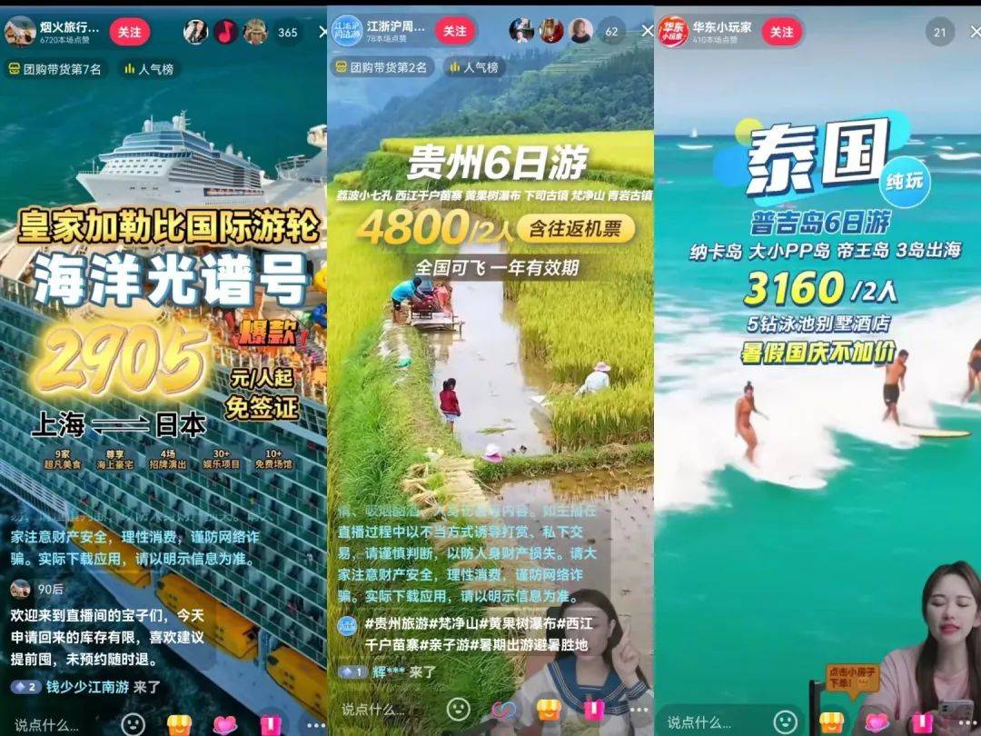 行业的复苏也意味着更多变现机会。虽然大部分人仍会选择“自由行”,享受于自己规划路线、做攻略,但当目的地过于遥远时,“报团旅行”也成为选择之一。与此同时,在抖音着力加码酒旅业务、带动本地生活板块增长的当下,越来越多的旅行产品出现在抖音直播间。卡思粗略浏览,其中包括几百元的“低价游”,也有大量几千元至万元不等的中高端旅游团购。